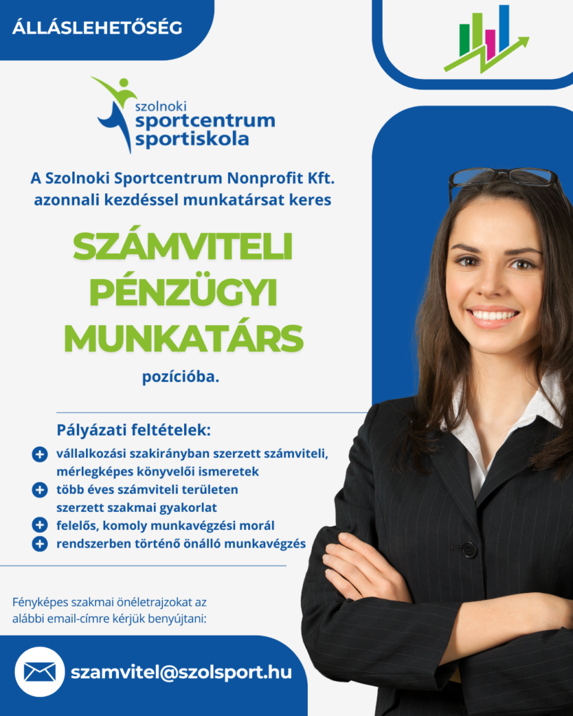 A Szolnoki Sportcentrum Nonprofit Kft. azonnali kezdéssel munkatársat keres SZÁMVITELI-PÉNZÜGYI MUNKATÁRS pozícióba.